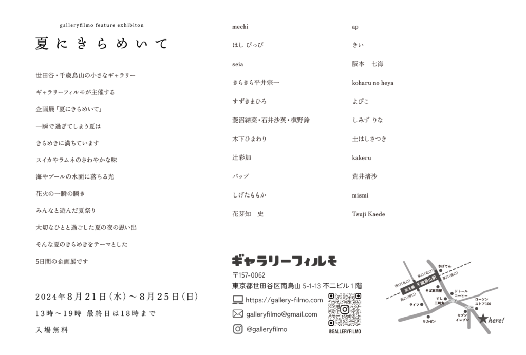 【展示】夏にきらめいて 2024-08-20 最終更新日時 : 2024-08-20 tsujiayaka ☆:.。. 展示のお知らせ📢 .。.:☆ 東京は世田谷にある可愛らしいギャラリーフィルモ さんの公募展 🍉夏にきらめいて🍉 に、参加いたしまーす🙋♀️ 上記リンクはInstagram、 こちらはギャラリーさんホームページになります。 8/21〜25の5日間近隣の方👤ついでにご旅行の方👥わざわざ観に行ってくださる方々👤👥👥👤 とっても可愛らしい外観のギャラリーさんです是非、観にきて下さい😊♡♪🌼 FacebookBluesky